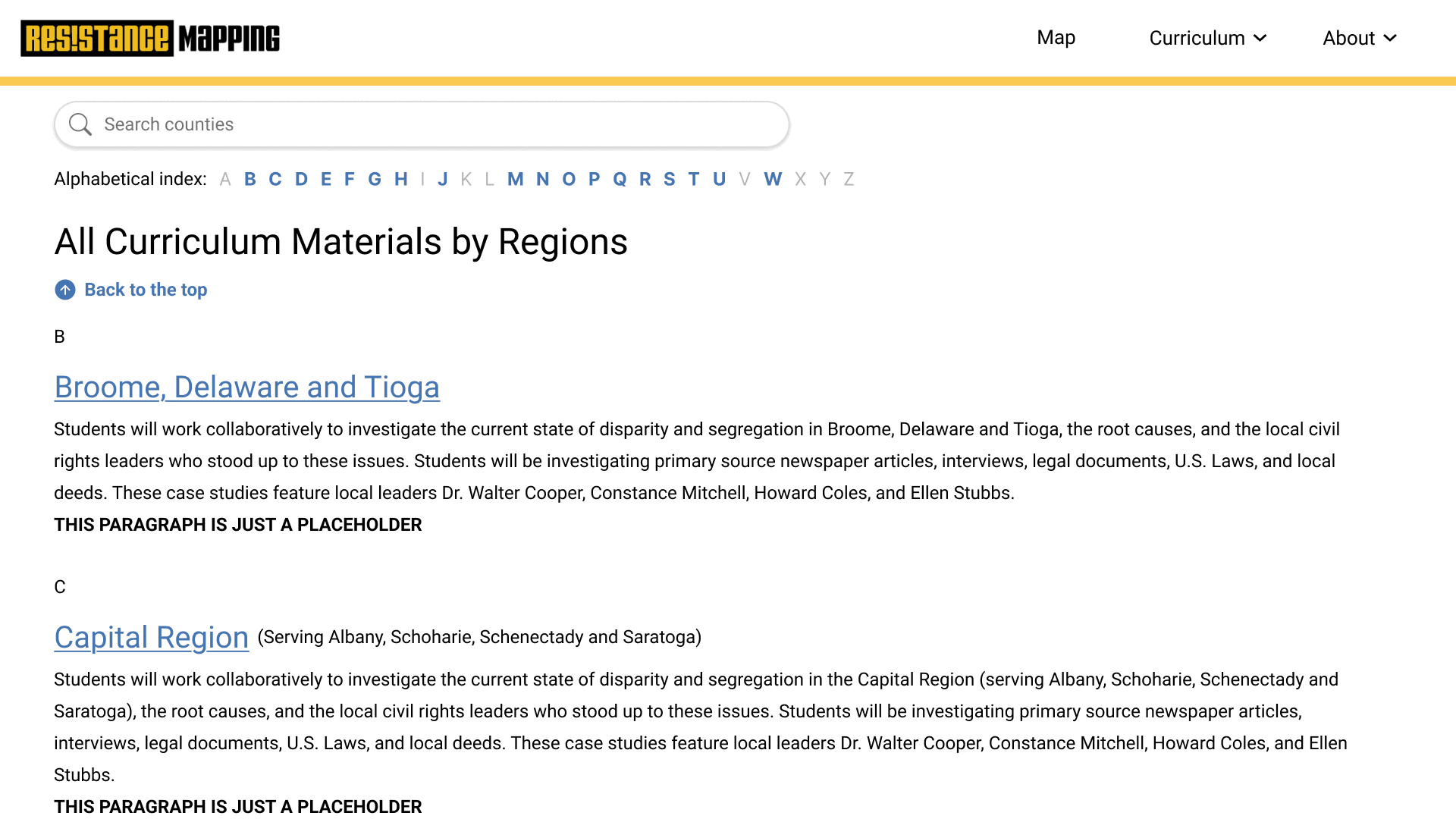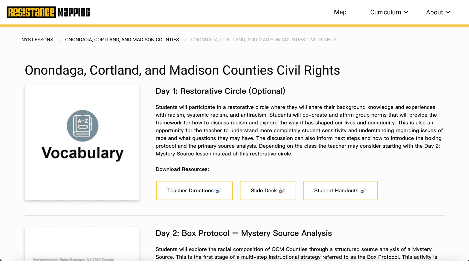 Local teachers using Resistance Mapping in class expressed difficulty finding specific curriculum and lesson plans. We learned from the Resistance Mapping team that curriculum was added without a standard template. Looking at these problems together, it became clear that creating a landing page for the curriculum and a standard template for lessons would solve both of these problems.